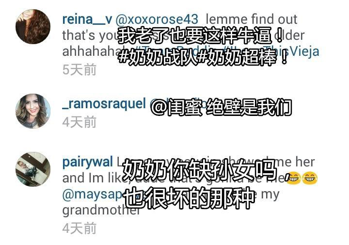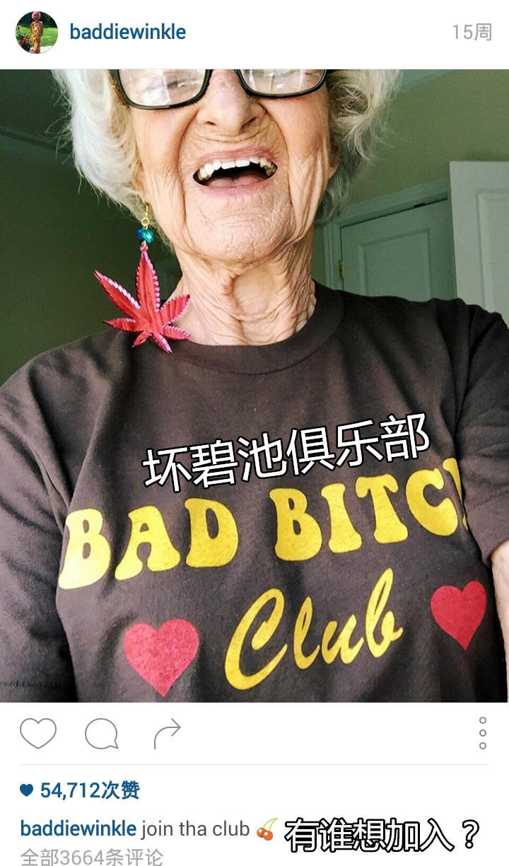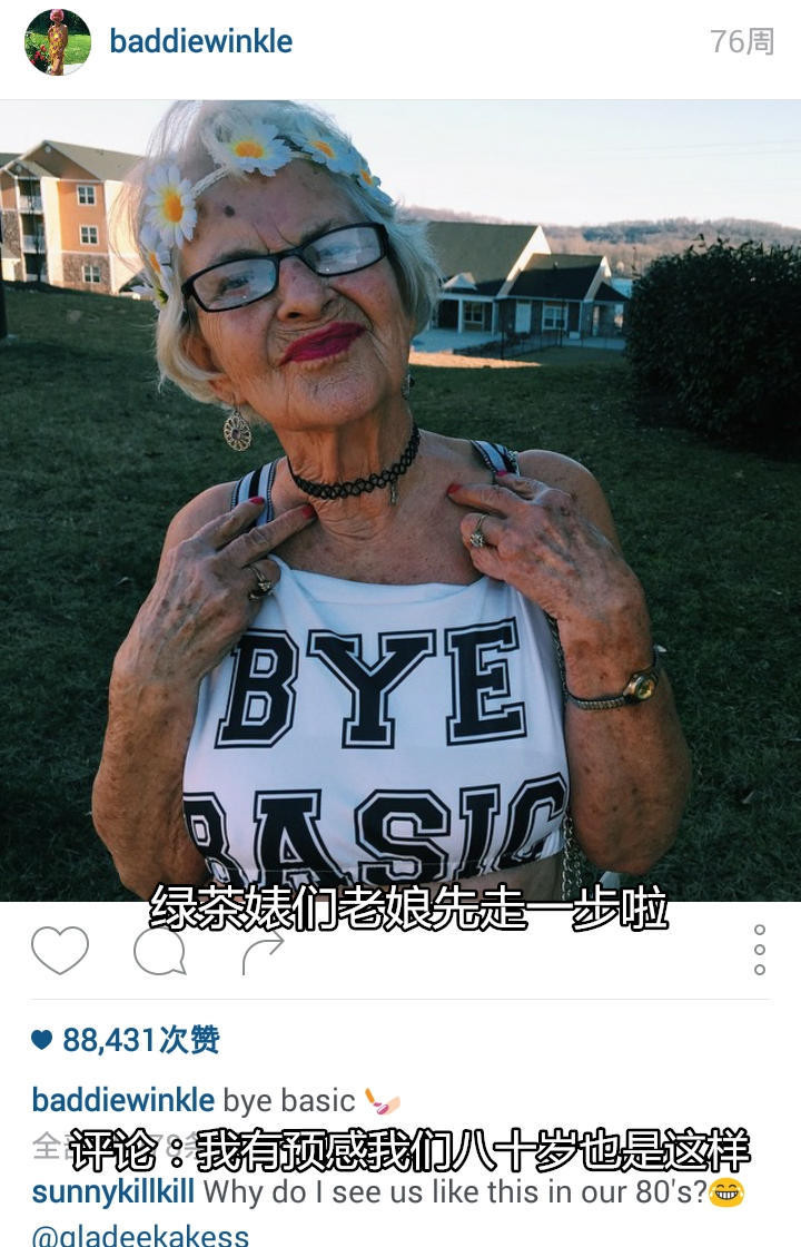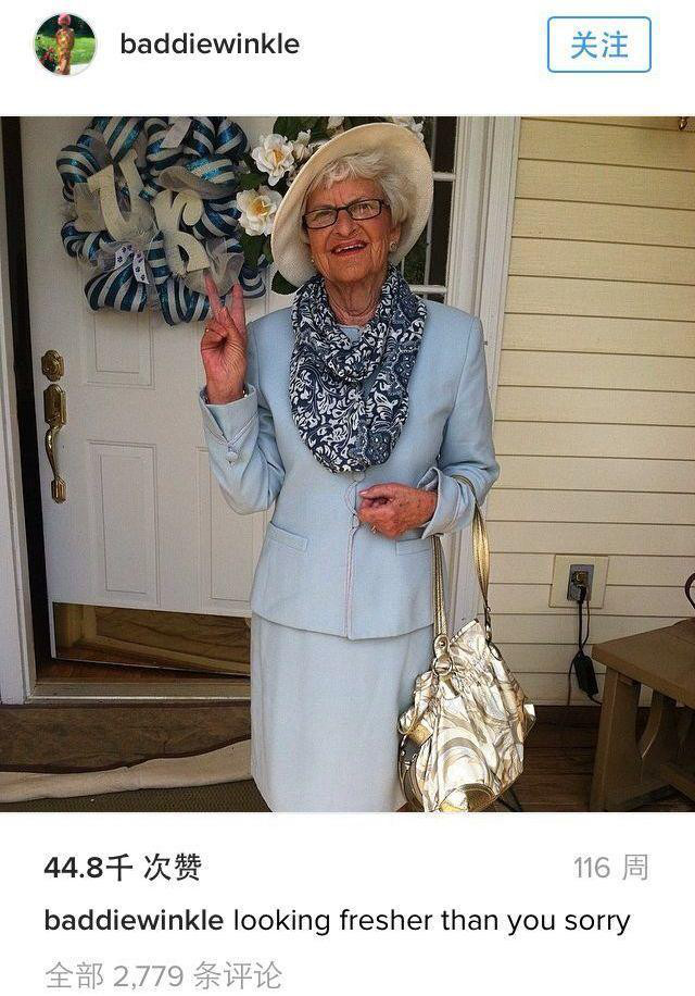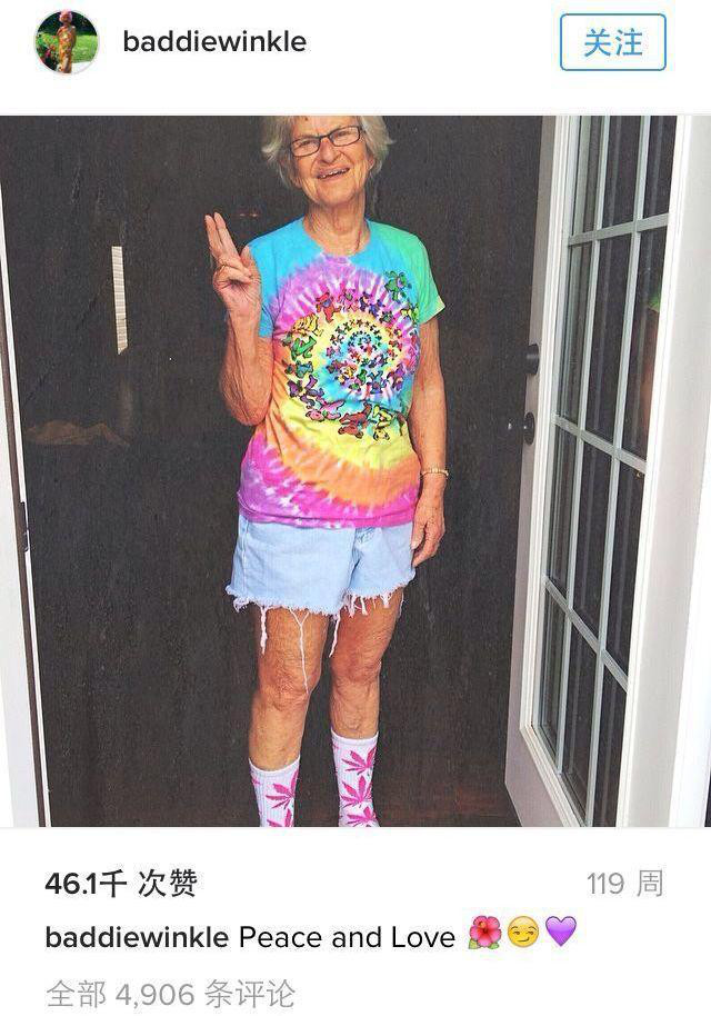 妹想到皂片一经po出,孙女的朋友纷纷点赞留言,夸奶奶很潮很酷很好看,给她很多的鼓励。奶奶自己也觉得穿的年轻点也挺好,于是少女心萌芽,立刻开了一个INS账号,寻思着做一个狂拽酷炫吊炸天的87岁资深少女