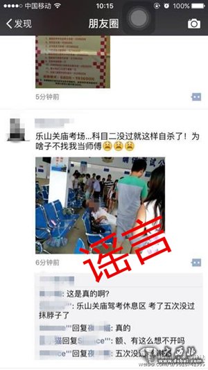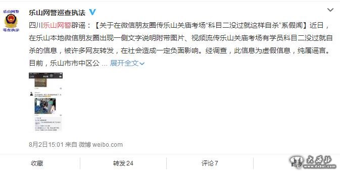 8月2号下午3点,四川乐山网警发布辟谣声明:近日,在乐山本地微信朋友圈出现一则“乐山关庙考场有学员科目二没过就自杀”的信息,附带图片、视频流传,被许多网友转发,在社会造成一定负面影响。经调查,此信息为虚假信息,纯属谣言。目前,乐山市市中区公安分局已介入调查处理。望广大网友不信谣、不传谣,以免因此承担相应法律责任。