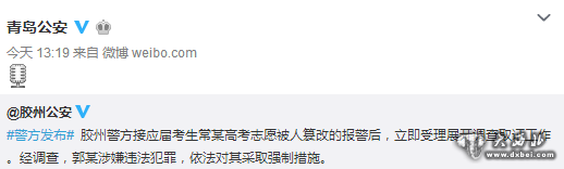 8月3日,胶州警方发布消息称,接应届考生常某高考志愿被人篡改的报警后,立即受理展开调查取证工作。经调查,郭某涉嫌违法犯罪,依法对其采取强制措施。