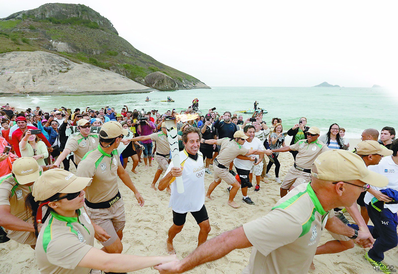 奥运火炬4 日在里约热内卢一处海滩传递,安保人员采用手拉手的方式将火炬手围住防范抗议者搅局。
