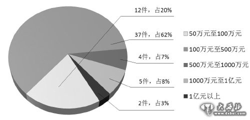“小官巨贪”案件,是指职务犯罪人员职务、级别不高(本文特指基层科级以下干部),但涉案金额在50万元以上的案件。2012年以来,江苏省镇江市检察机关查办此类案件共60件72人,其中,2012年查办6件7人,2013年查办12件13人,2014年查办13件16人,2015年查办17件23人,2016年上半年已查办12件13人(如图一),呈逐年上升趋势。在所办案件中,涉案金额50万元至100万元有12件,占查办案件总数的20%;涉案金额达100万元至500万元有37件,占查办案件总数的62%;500万元至1000万元有4件,占查办案件总数的7%;1000万元至1亿元有5件,占查办案件总数的8%;1亿元以上有2件,占查办案件总数的3%(如图二)。“小官巨贪”案件频发,不仅危害后果严重,而且群众反映强烈,严重影响了干群关系,亟须引起重视。