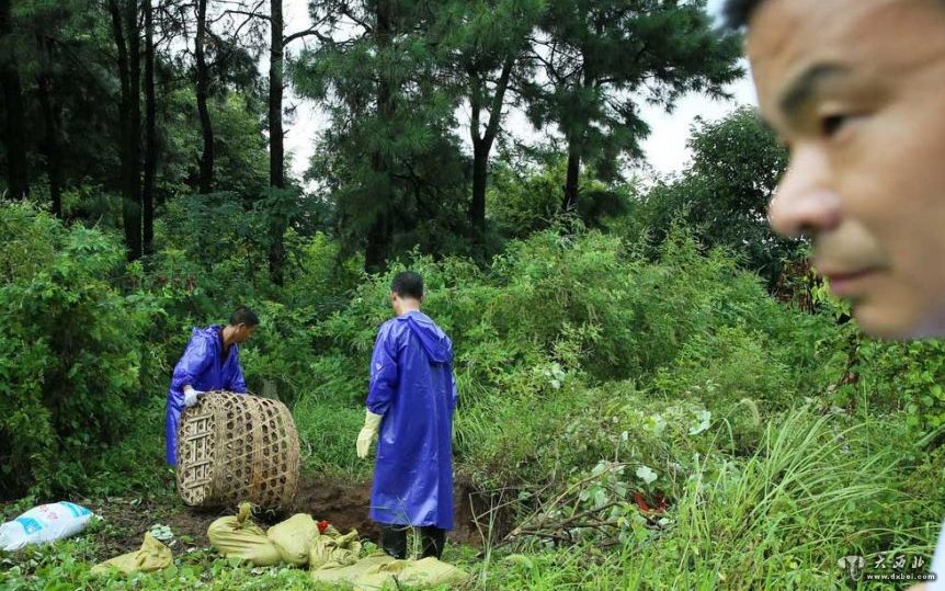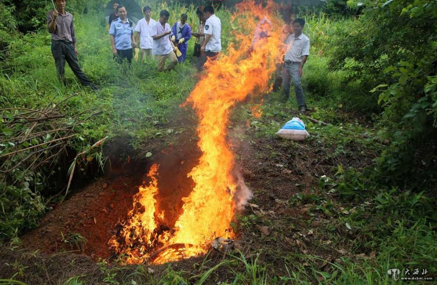 经过一上午的工作,打狗队终于将村里的疑似狂犬病狗扑杀完毕,他们用背篓扛着消毒粉、煤油、柴草和打过的狗,走在田间小路上,来到之前准备好的土坑,这里远离水源和村庄。打狗队员将装狗的蛇皮袋扔进土坑中,浇上煤油进行焚烧、消毒和深埋处理。