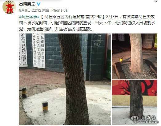 商丘市政府新闻办官微消息称,8月8日,网上曝光商丘市梁园区出现个别路段人行道路硬化时,将行道树池一体硬化,造成“水泥封树”现象,引起梁园区委、区政府的高度重视。
