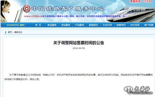 9日,中国铁路客户服务中心在官方网站发布《关于调整网站售票时间的公告》。《公告》称,为了便于旅客通过12306网站和“铁路12306”手机APP购买发车时间较早的列车车票,自2016年8月10日起,网站和手机APP每天开始售票的时间由7:00提前至6:00。