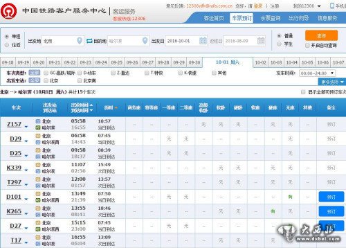 中新网记者注意到,部分热门线路的火车票已经被一抢而光。如,10月1日北京到哈尔滨的13个发售车次中,已有8个车次的火车票全部售完,其余车次也只仅剩无座或硬座。