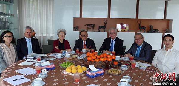 8月10-11日,菲律宾前总统拉莫斯(中)在香港与老朋友傅莹女士(左三)(中国全国人大外事委员会主任委员、1998年至2000年中国驻菲律宾大使),进行了愉快、友好的会面。他们以私人身份,本着四海同心的精神,探讨如何推进中国与菲律宾之间的和平与合作。洪少葵 摄