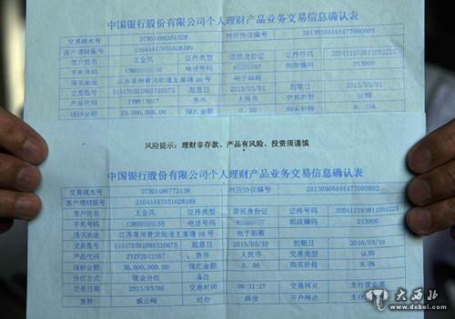 “在2011年2月底,原用于购买新股的6个账户的资金,被全部打到了母亲的尾号为4015的理财卡里;在9月底和10月初,我又分两次把3300万元资金打到了这个理财卡里,并购买了中行的理财产品。”说罢,王英彦将两张《中国银行个人理财产品业务交易信息确认表》交给了记者。