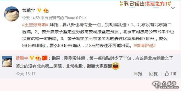 王宝离婚事件曝出后,有消息称经北京第二医院证实,王宝强曾对两个孩子做过亲子鉴定,DNA的相似度竟然只有2%-8%,根据医疗结果判断,王宝强并非两个孩子生父。随后网友“曾鹏宇”发微博专业辟谣,称北京能做亲子鉴定的没有北京第二医院,亲子鉴定关于亲缘关系的表述比率都是99.99%,要么99.99%排除,要么99.99%确认,2-8%的表述不可能出现。