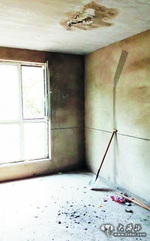 在房子西南角的卧室与客厅相隔的一堵墙上,记者看到了一个大洞。王大永说:“这是我用手拍墙拍出来的,验房时,我想既然有空洞,里面究竟什么样?我很想看看,就用手拍了一下,结果墙就出了个洞,薄薄的一层水泥,里面是苯板。我在这里拍出了个洞,在检查厨房的时候,我又在厨房的东墙上拍出了个洞。”