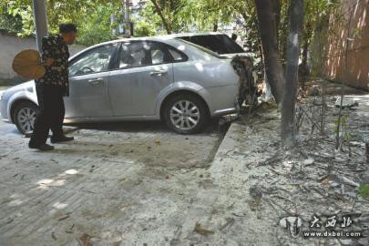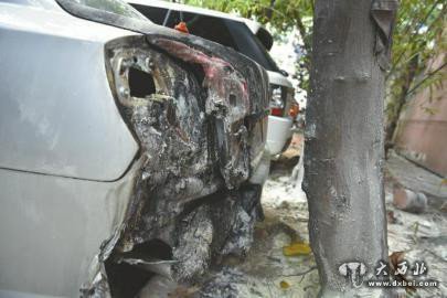 16日下午,记者来到少陵路21号,小区围墙外花坛旁,停着一辆银灰色的别克汽车,其尾部左侧已被烧得面目全非,车上电线都已裸露在外。此时,空气中仍可闻到一股焦糊味。而周围地面上,铺满了灭火器喷出的白色粉末。
