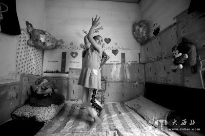 小雅妍在床上表演自创的舞蹈。