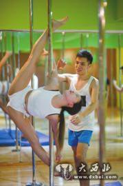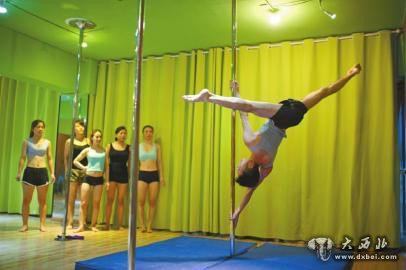 王建给学员示范钢管舞技巧。