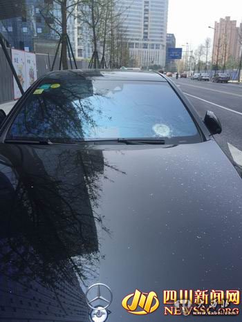 据曾先生介绍,奔驰轿车是公司的,是一辆新车,才开了10个月。今天上午,他独自一人从华阳开车到吉泰路附近办事。当车至吉泰路的一个红绿灯处时,他的电话响了,为了行车安全,曾先生将车停在路边,准备打完电话再继续行车。“我连电话都还没有打完,就听到咚一声,一个东西掉在副驾驶前方的挡风玻璃处,吓得我赶紧挂了电话。”所幸,挡风玻璃没有被砸穿,曾先生没有受伤。