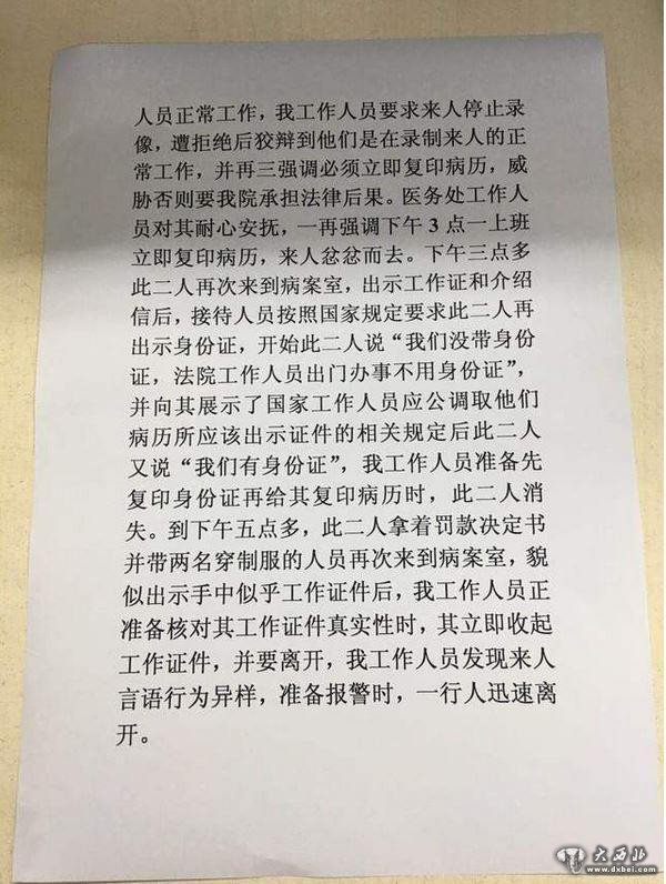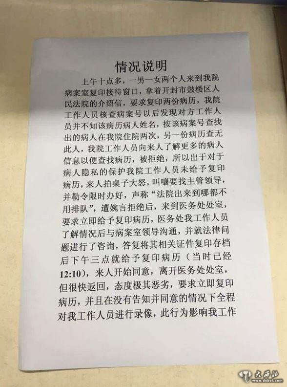 记者从网上披露的一份河南省人民医院病案室工作人员写给医院的情况说明中注意到,该工作人员称,之所以拒绝复印病例是出于对病人的隐私。而对方干警在遭到拒绝后情绪失控,拍桌发怒。对于经院方医务处协调后,当日下午三时再次拒绝干警,系干警未按国家规定出示身份证。