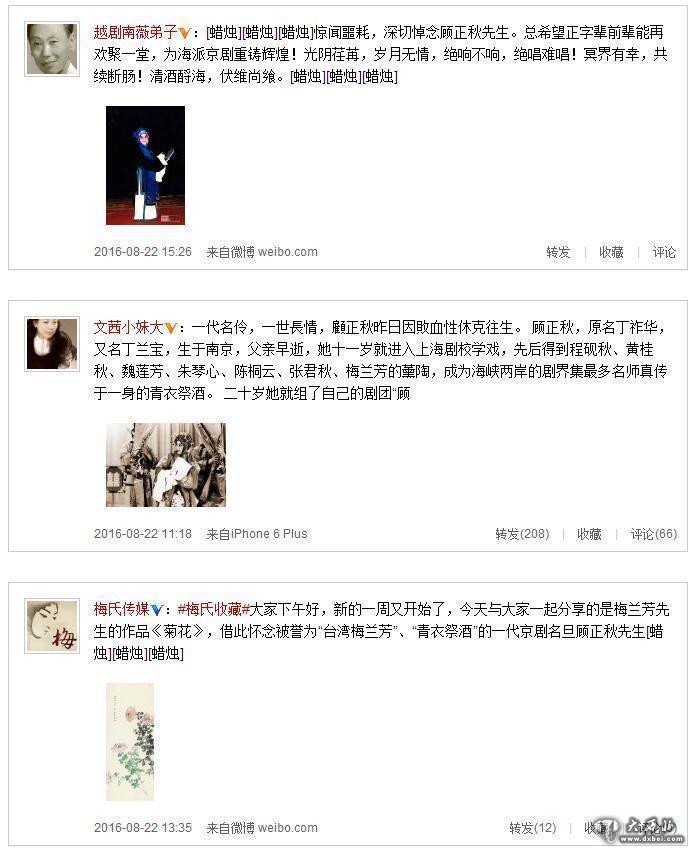 昨天(8月21日)下午,中国著名京剧表演艺术家,被誉为“台湾梅兰芳”的一代名伶顾正秋女士,因败血性休克辞世,寿享87岁。随后,梅氏传媒及台湾媒体人陈文茜等人在微博证实并悼念顾正秋先生。