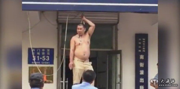 网传视频显示,在锦州市公安局古塔分局南街派出所门口,一名男子赤裸上身,用绳子套住自己的脖子,欲上吊自杀。在此过程中,男子还抽着烟。一旁,多名穿着民警制服的男子看护。