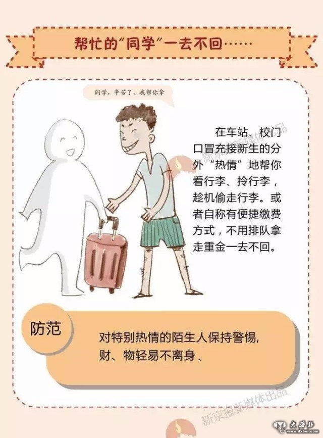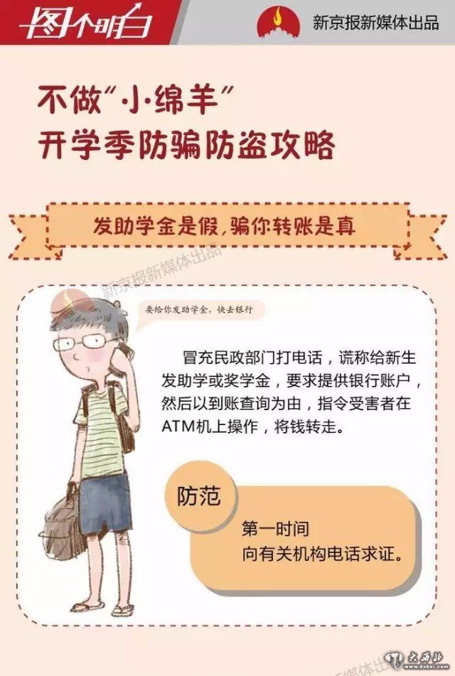 开学季,骗子们盯上了新生和他们的家长,“发助学金”只是各路骗子所用的其中一个伎俩,其他还有贷款陷阱、假冒接新生偷盗财物、假冒师长收费等等。新生和家长们,一定要擦亮双眼、提高警惕,尤其以下七种骗术一定要知道。(更多新闻,请关注新京报微信公号:bjnews_xjb)