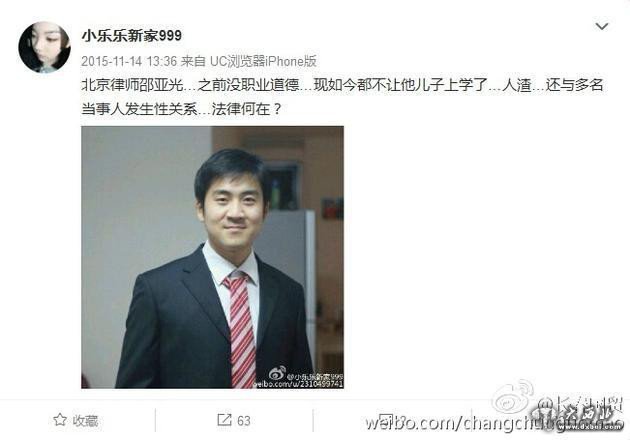 2015年11月更在微博曝光一名小男孩和邵亚光的照片,并透露是父子俩。照片中两人正在玩游戏,小家伙约莫四五岁的样子,看上去十分的乖巧可爱。隔天,此女网友再次在微博中写道:“北京律师邵亚光,之前没职业道德,现如今都不让他儿子上学了,人渣,还与多名当事人发生性关系,法律何在?”