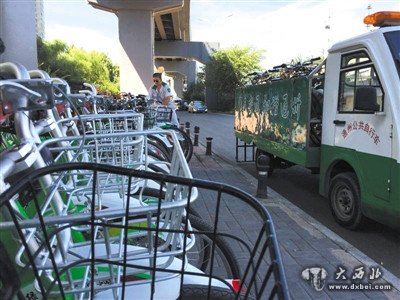 10分钟内,记者看到通州公共租赁自行车调运车来了三次,每次都卸下一批车辆和那些车挤在一起。调度员辛师傅卸完这一车后点了点数量,他说,这些车都是从对面的地铁站口拉过来的,通州潮汐式交通明显,早上上班出通州方向的车架子车满为患,调度员只能临时在现场收车。等高峰结束以后,再用调度车一点一点运到对面的站口来。“晚高峰的时候这边用车量大,我们搬过来准备好,下班的时候还得来个人现场引导大家租车。”