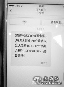 袁政益还将自己的建设银行卡给燕子看,银行卡尾数是0530,其中一条“95533”发的短信息显示卡里刚消费1000元,还剩211万元之多!
