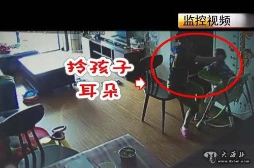 监控显示:9月1日11:30,丁女士家中,一名中年女子正在给一名男童喂饭。但由于男童的不配合,中年女子随手拿起一件物件儿,击打男童的头部。顺势拎起男童的耳朵,让男童大哭不止。