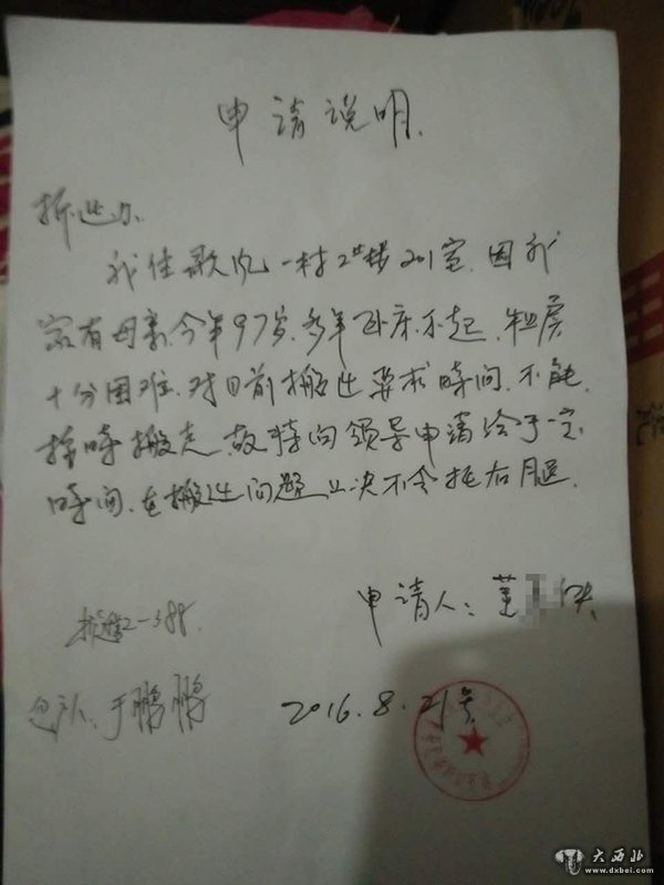 赵先生向澎湃新闻记者出示了一张《申请说明》原件,日期为今年8月21日。说明称,由于家母多年卧床不起,租房十分困难,不能按目前要求的时间搬走,“特申请给予一定时间,在搬迁问题上绝不会拖后腿”。申请人为董某侠,即赵先生的母亲。