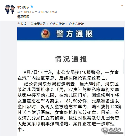 天津市公安局河东分局9月8日晚通报,该局已立案侦查,对涉事汽车司机及幼儿园负责人采取了刑事强制措施。