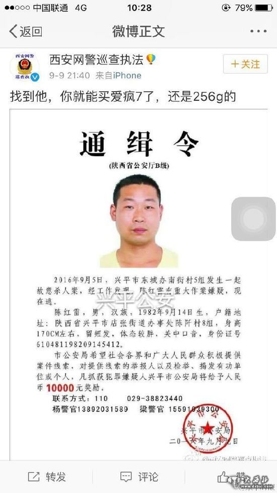 9月5日,陕西省东城办南街村5组发生一起杀人案,经警方侦查发现,陈红雷有重大作案嫌疑,现嫌犯在逃。陕西省公安厅发布B级通缉令,向广大群众征集线索,对提供线索的举报人以及检举揭发有功单位或个人, 凡抓获犯罪嫌疑人,兴平市公安局将给予人民币10000元奖励。@西安网警巡查执法 发布微博称,“找到他,你就能买爱疯7了,还是256g的。”