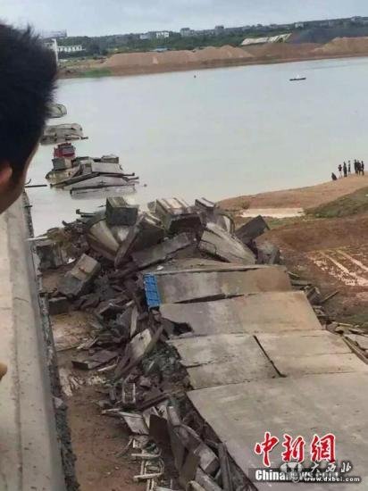 9月11日上午9时17分,江西泰和县319国道泰和赣江公路大桥一废弃老桥在施工作业时发生坍塌,整座桥梁断裂,部分桥体落入赣江,当地消防部门正在开展救援。截至目前,已有5名受伤人员送往医院抢救,初步确定3人失联。钟欣 摄