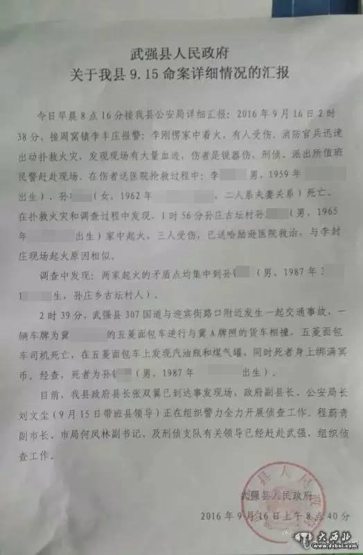 9月18日上午,微博网友 @衡水生活 发布的一份盖有武强县人民政府章印的《武强县人民政府关于9.15命案详细情况汇报》。说明称,9月16日凌晨2时38分,衡水市武强县周窝镇李封庄村李刚愣家着火,李刚愣(男,1959年7月5日出生)、孙巧梅(女,1962年8月9日出生,二人系夫妻关系)被刺伤,在医院救治过程中死亡。