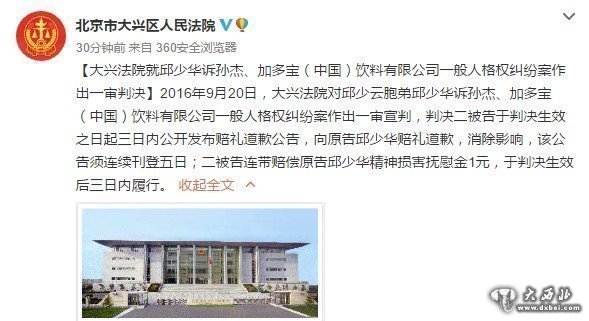 新华社北京9月20日电(记者罗沙、熊琳)北京市大兴区人民法院20日对邱少云烈士之弟邱少华诉孙杰、加多宝(中国)饮料有限公司一般人格权纠纷案一审公开宣判,判决二被告于判决生效之日起三日内公开发布赔礼道歉公告,向原告邱少华赔礼道歉,消除影响,该公告须连续刊登五日;二被告连带赔偿原告邱少华精神损害抚慰金1元,于判决生效后三日内履行。