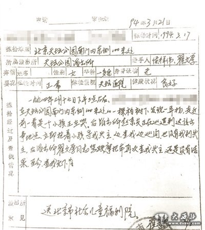 时间追溯到22年前。1994年3月17日的下午,正好是侯祥炜值班。侯祥炜接到一个中学生打来的电话,说天坛公园南门内东侧一棵柏树下有一个一岁多的小女孩在哭。侯祥炜和同事赶到时,小女孩正被围观群众围住,有好心人在哄着她,她已经不哭了。小女孩穿着一身花棉袄,会走路但还不会说话,右手裹着白布。侯祥炜打开白布,看到女孩右手的手指全黑了。