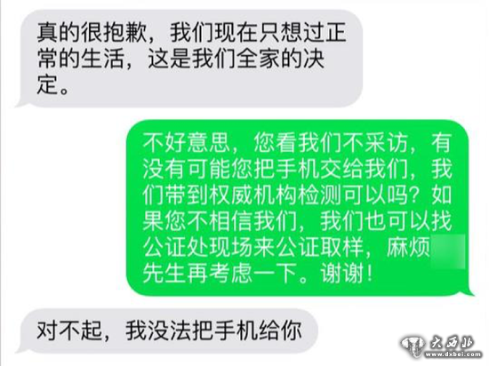 随后记者在短信中提出,如果他们不愿意接受采访,是否可以像曾经答应的那样,通过公证的方式把手机交给《消费主张》送去检测,但这位消费者的答复是“对不起,我没法把手机给你”。