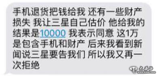 据他透露,他提出的解决方案是:手机退货,把手机钱退还,另外还有一些财产损失。据三星公司上门后估价,最后估算的金额是1万元,包括手机和财产在内,这位消费者表示愿意接受。