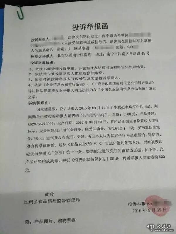 举报信中说,9月11日,谢先生到华联超市购买生活用品,期间购得超市销售的“旺旺雪饼84g”一袋,单价5.00元。其产品正面显著位置较大字体标示: 天天吃旺旺,运气会旺哦。因受其诱导,所以购买了一袋,买回家后连续食用多天,运气并没有变旺、变好。