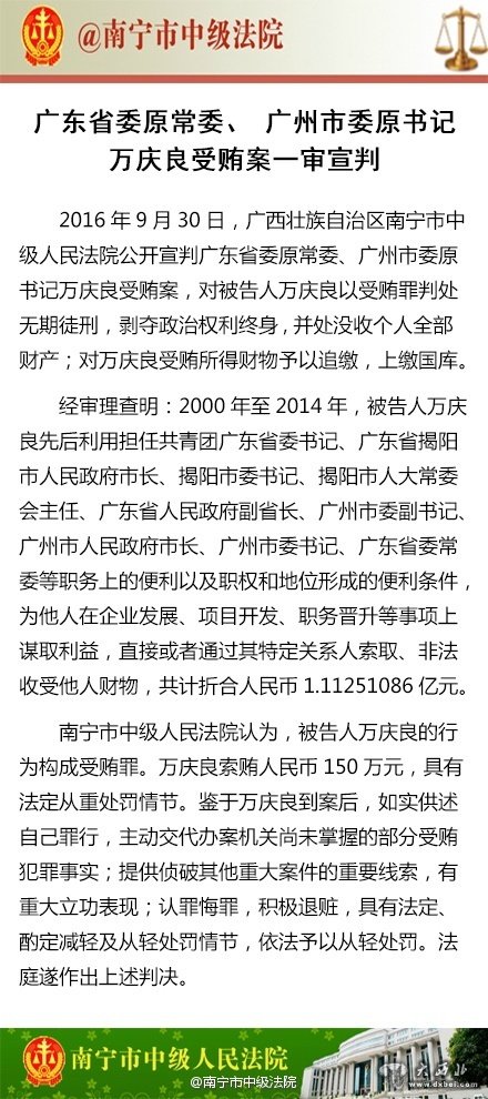 #万庆良受贿案一审宣判# [万庆良:受贿罪一审判处无期徒刑]2016年9月30日,广西壮族自治区南宁市中级人民法院公开宣判广东省委原常委、广州市委原书记万庆良受贿案,对被告人万庆良以受贿罪判处无期徒刑,剥夺政治权利终身,并处没收个人全部财产;对万庆良受贿所得财物予以追缴,上缴国库。