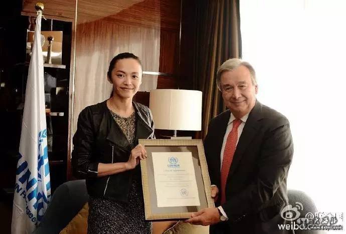 2013年,时任联合国难民高专古特雷斯正式授予姚晨难民署中国亲善大使。