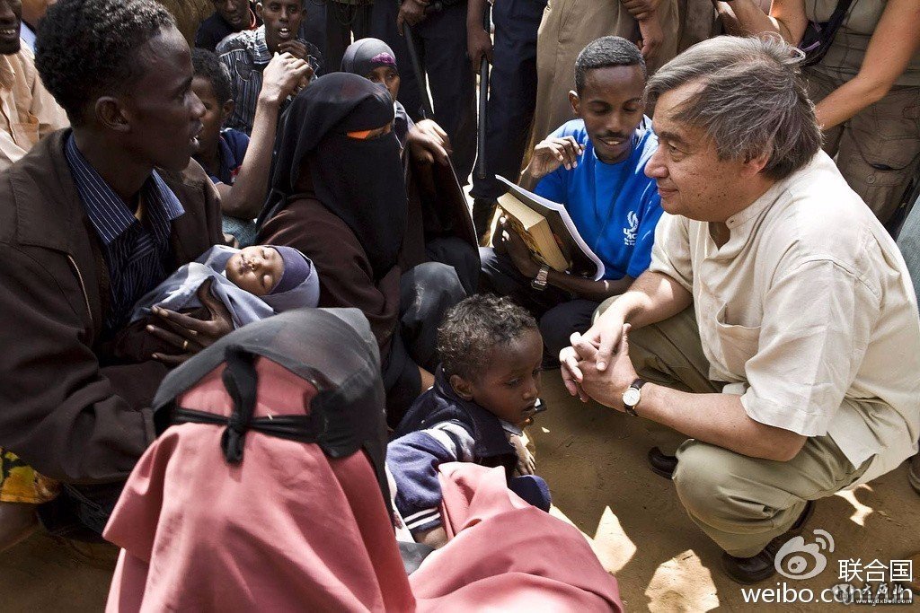 2008年6月,时任联合国难民高专古特雷斯前往肯尼亚达达布难民营看望难民。