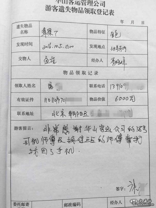 一北京游客领取丢失物品后在登记表上留言表示感谢。 华山景区管委会供图