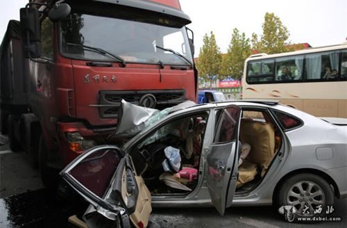 现代轿车由东向西行驶,在撞向正前方一辆SUV车后猛打方向至逆行道,撞向一辆由西向东正常行驶的半挂车前轮,随后又撞向该半挂车后面一辆正常行驶的半挂车车头,第三次撞击猛烈导致轿车直接被撞毁。