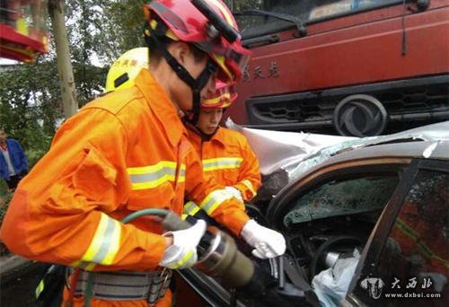 消防官兵立即用液压破拆工具对轿车进行破拆,将被困者周围障碍物进行清除。