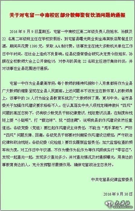 据晨报长治微信公众号消息,2016年9月9日教师节前夕,山西长治屯留一中南校区部分教师在工作日期间中午到饭店聚餐饮酒,在社会上造成不良影响。日前,屯留县纪委就此事进行了通报批评,但是这份通报引发了网友的热议。【湖南处理官员违规聚餐案:一县委常委被免职】