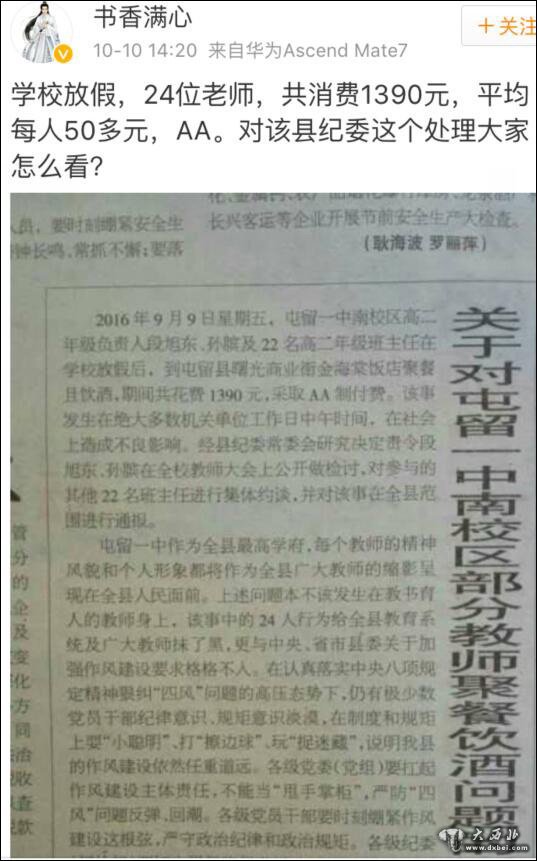 网友@书香满心在微博发布了这份通报,称“学校放假,24位老师,共消费1390元,平均每人50多元,AA。对该县纪委这个处理大家怎么看? ”引发网友热烈争论。