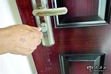 胡家的门锁被强力胶死死堵住,钥匙无法插进锁眼。 本版图片/晨报记者 张佳琪