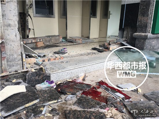 肇事的奔驰车停在人行道上,周围全是被它撞坏的轿车,共6辆。其中一辆本田轿车受损最为严重,直接被撞到邮储银行的ATM自助银行内,地上全是玻璃渣。在本田车的右后轮处,还留下了一只运动鞋和一滩血迹。