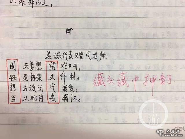 随着高考改革进行,闫井顺认为国学整体所占比重会增加,于是也对同学加强了这方面的训练。前两天,闫井顺布置了一项写诗的作业,没想到周钲的作业一交上来,他就发现了其中暗藏的乾坤。