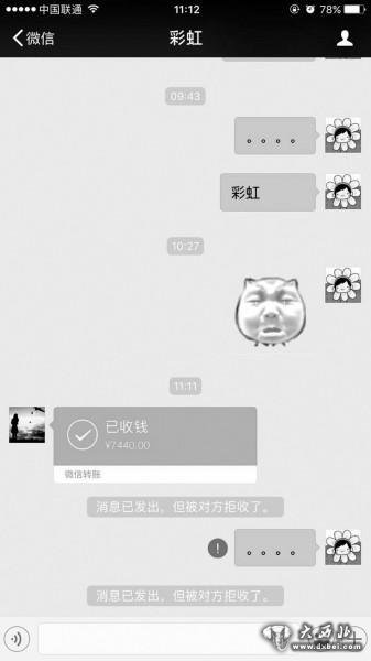 朱女士明白,如果“彩虹”不收钱,这钱24小时后会退回。没有料到的是,“彩虹”突然收了钱,收钱之后立即在微信里将朱女士拉黑。