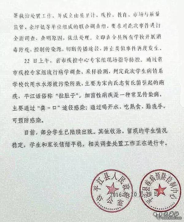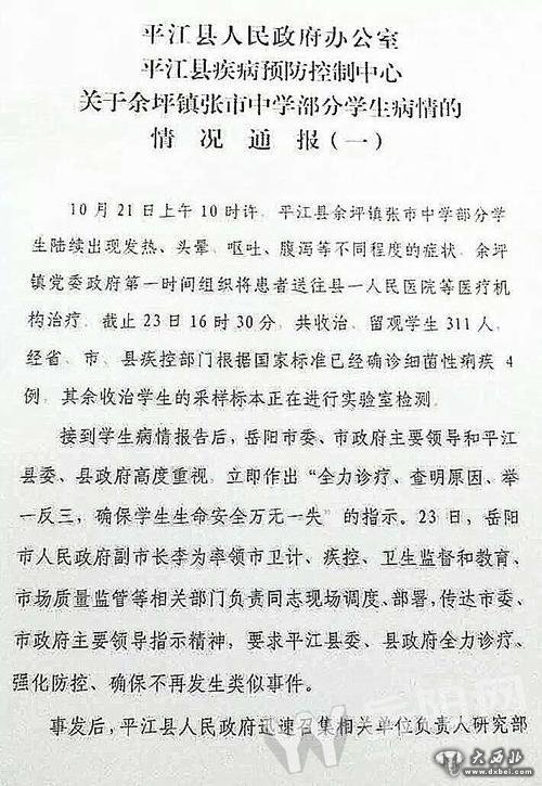 10月21日,湖南省岳阳市平江县余坪镇张市中学有多名学生因高烧、腹泻、呕吐被送往医院急救。23日,平江县政府办公室、县疾病预防控制中心对此事做出通报,判定此次学生病情系学校饮用水源被污染所致,主要为宋内氏志贺氏菌引起的痢疾。