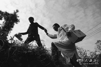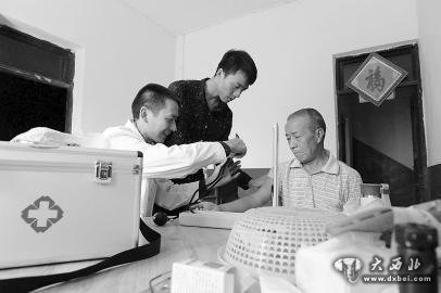 放假回家,沈兴培为村民检查身体,儿子沈霖(中)在旁边为父亲打下手。