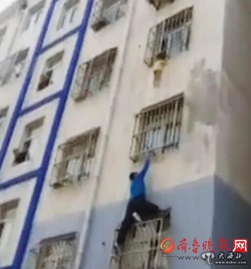 梁磊从楼外徒手爬上三楼,站在防盗窗上托举孩子十几分钟。(视频截图)